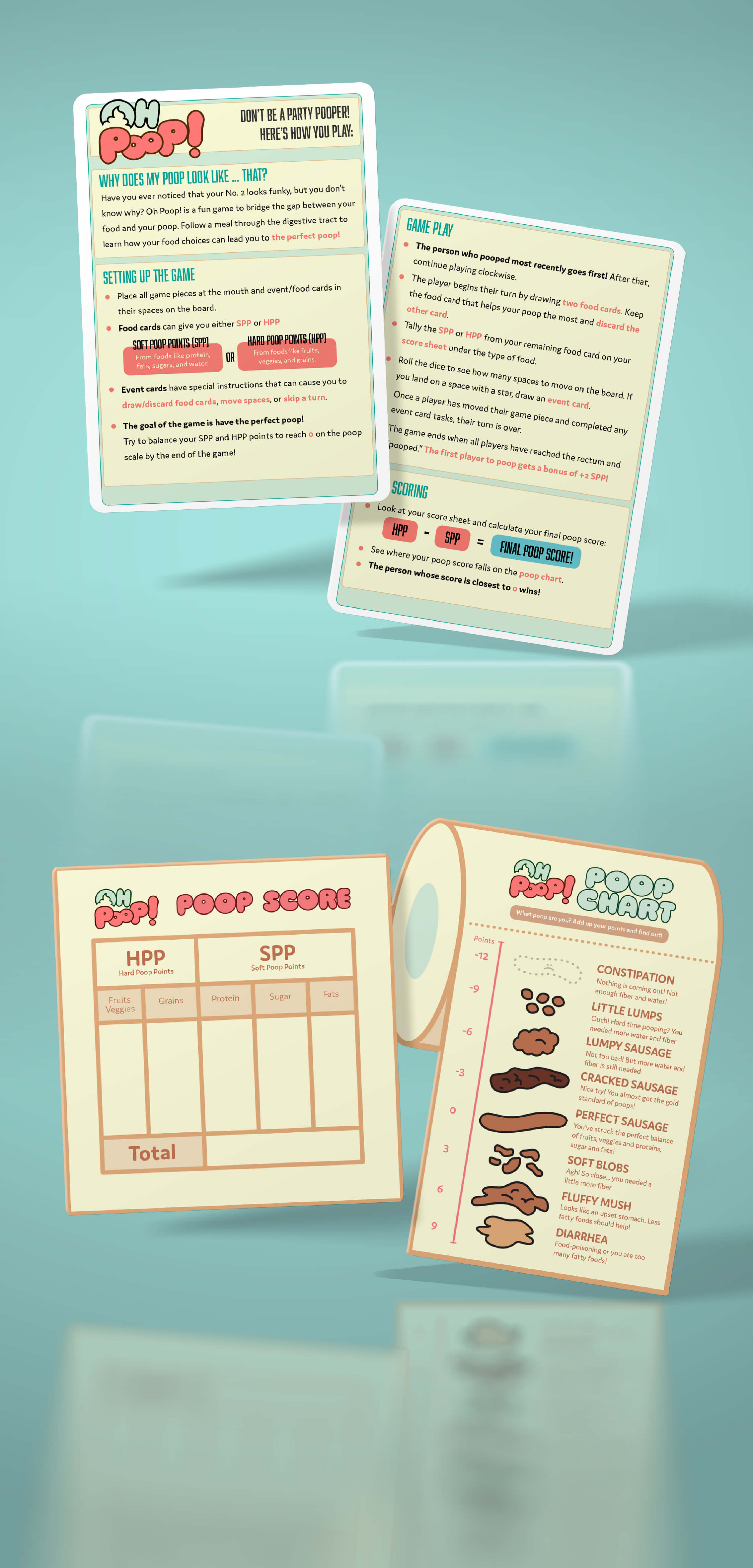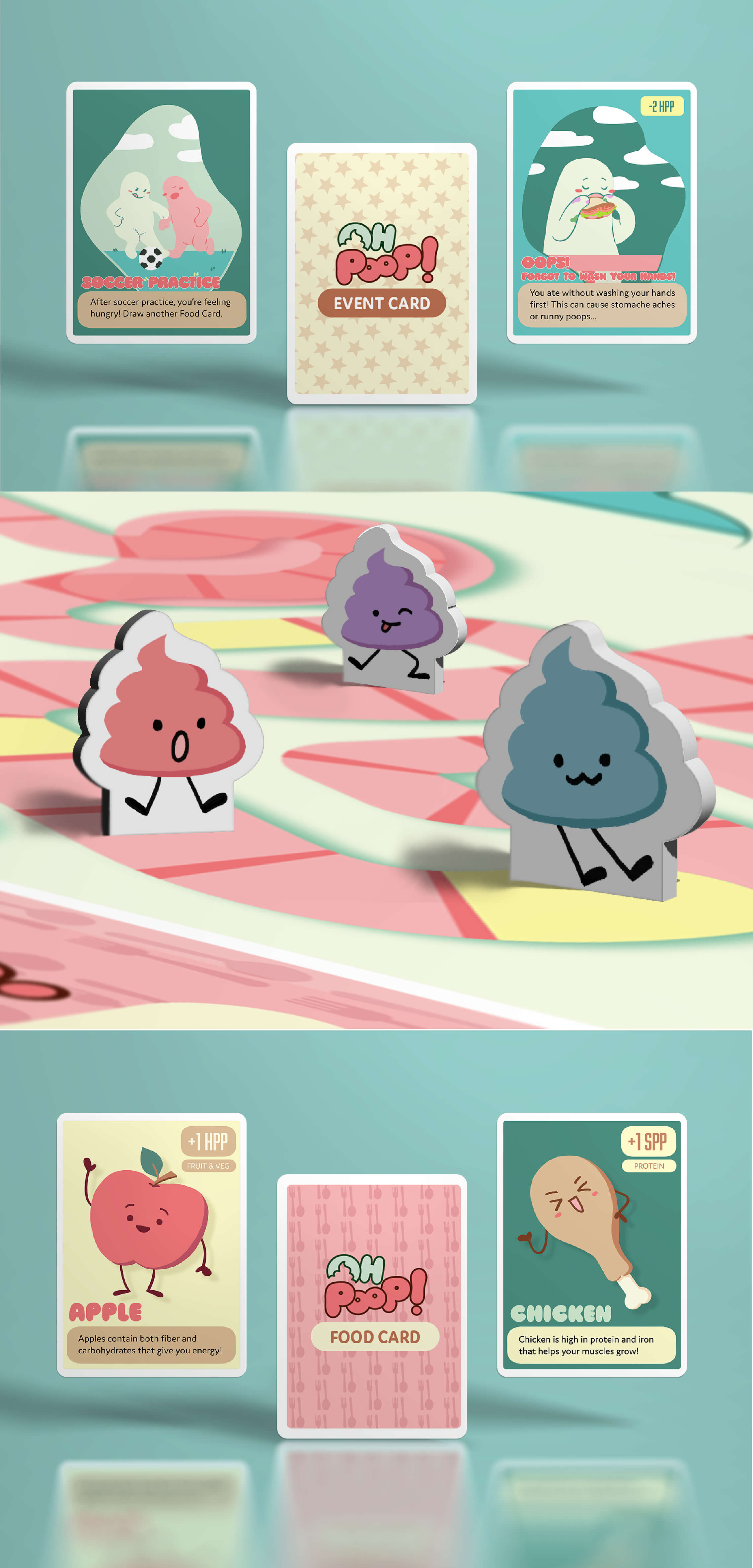 Ever wondered why your poop looks… like that? Oh Poop! is a board game bridging the gap in nutritional and digestive education in Canadian elementary schools. Collect food and event cards as you race to the end of your digestive tract—whoever ends with the perfect poop wins!